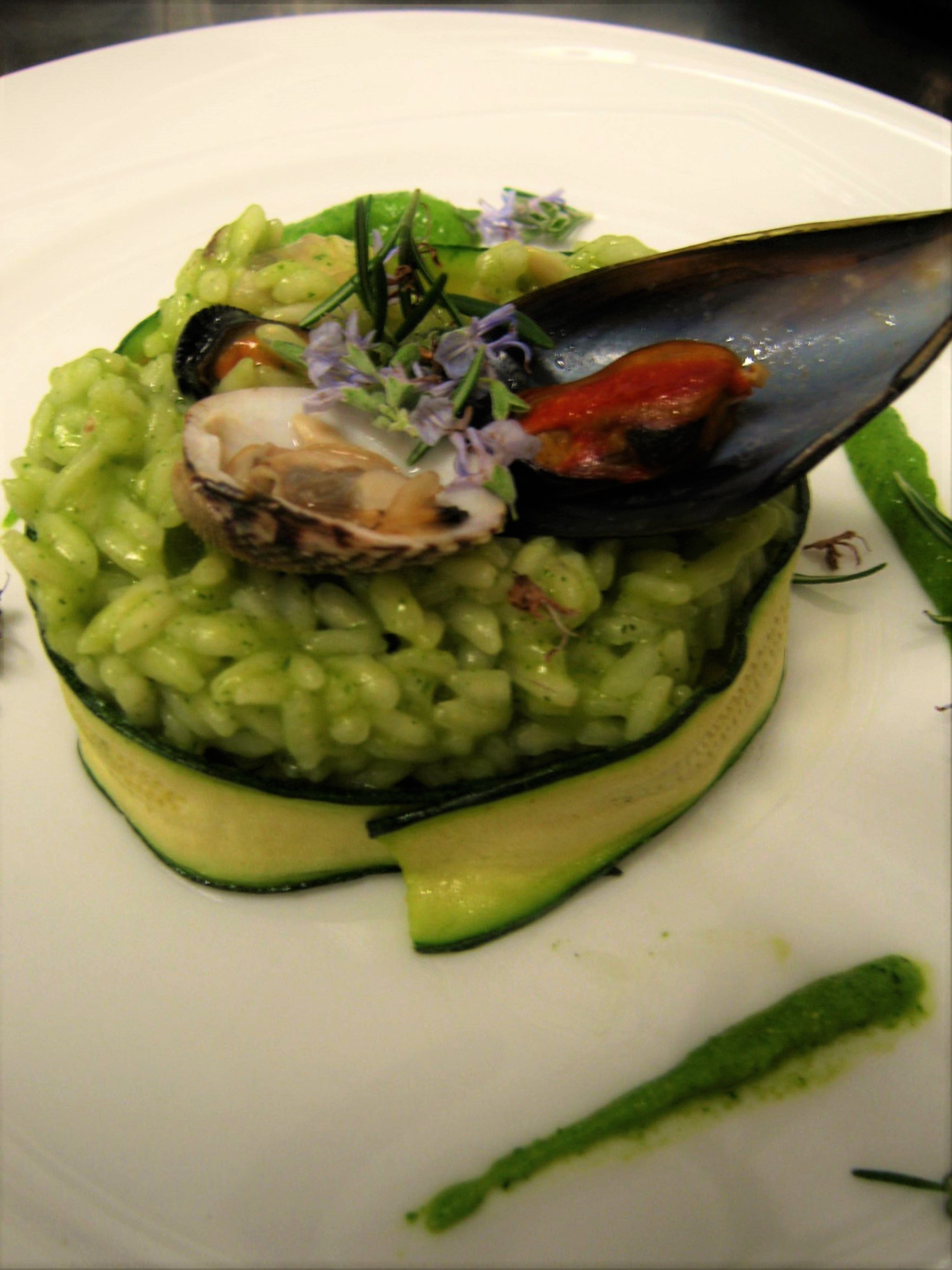Il risotto con pesto di zucchine, cozze, tartufi di mare e fiori di rosmarino selvatico.