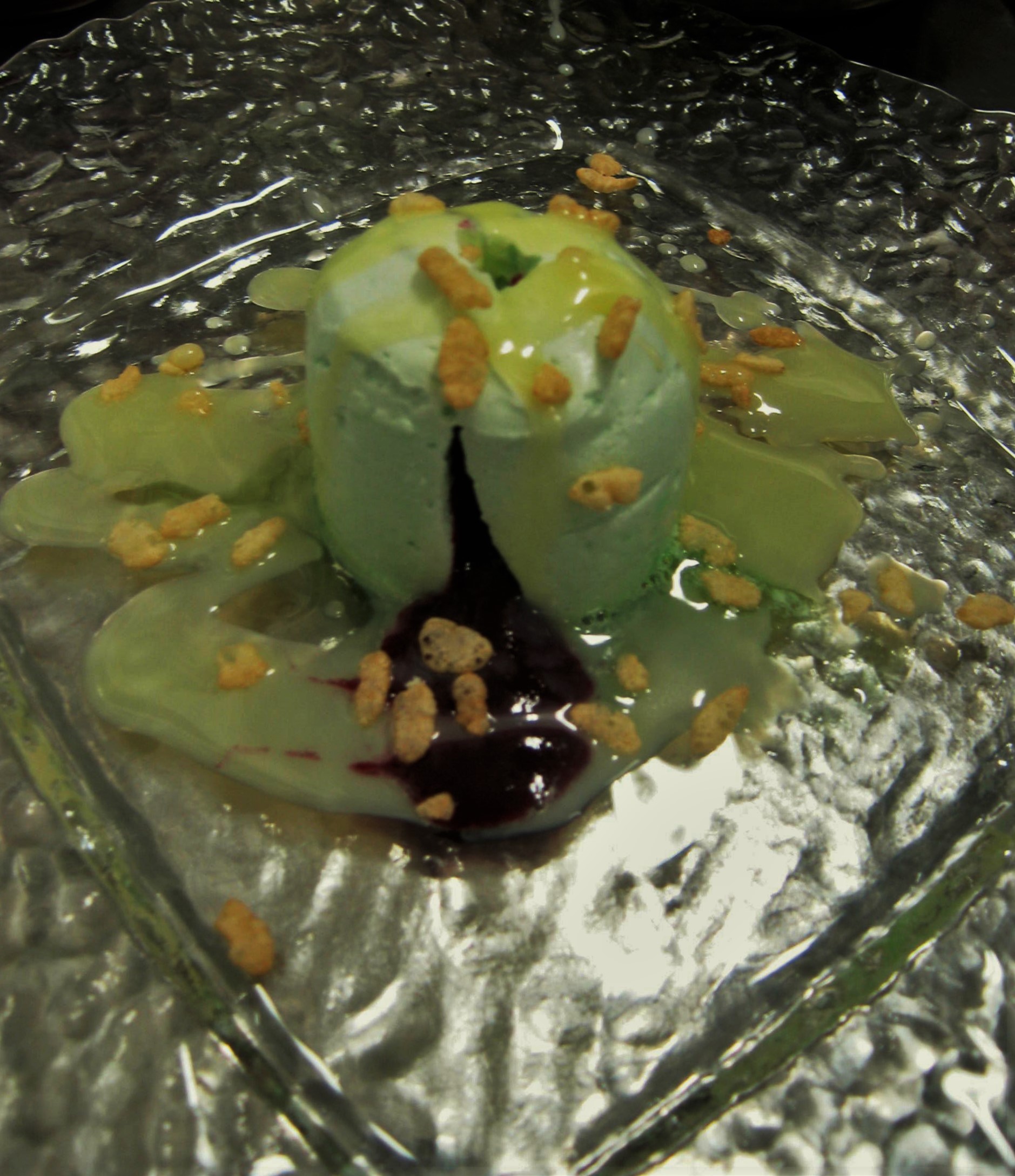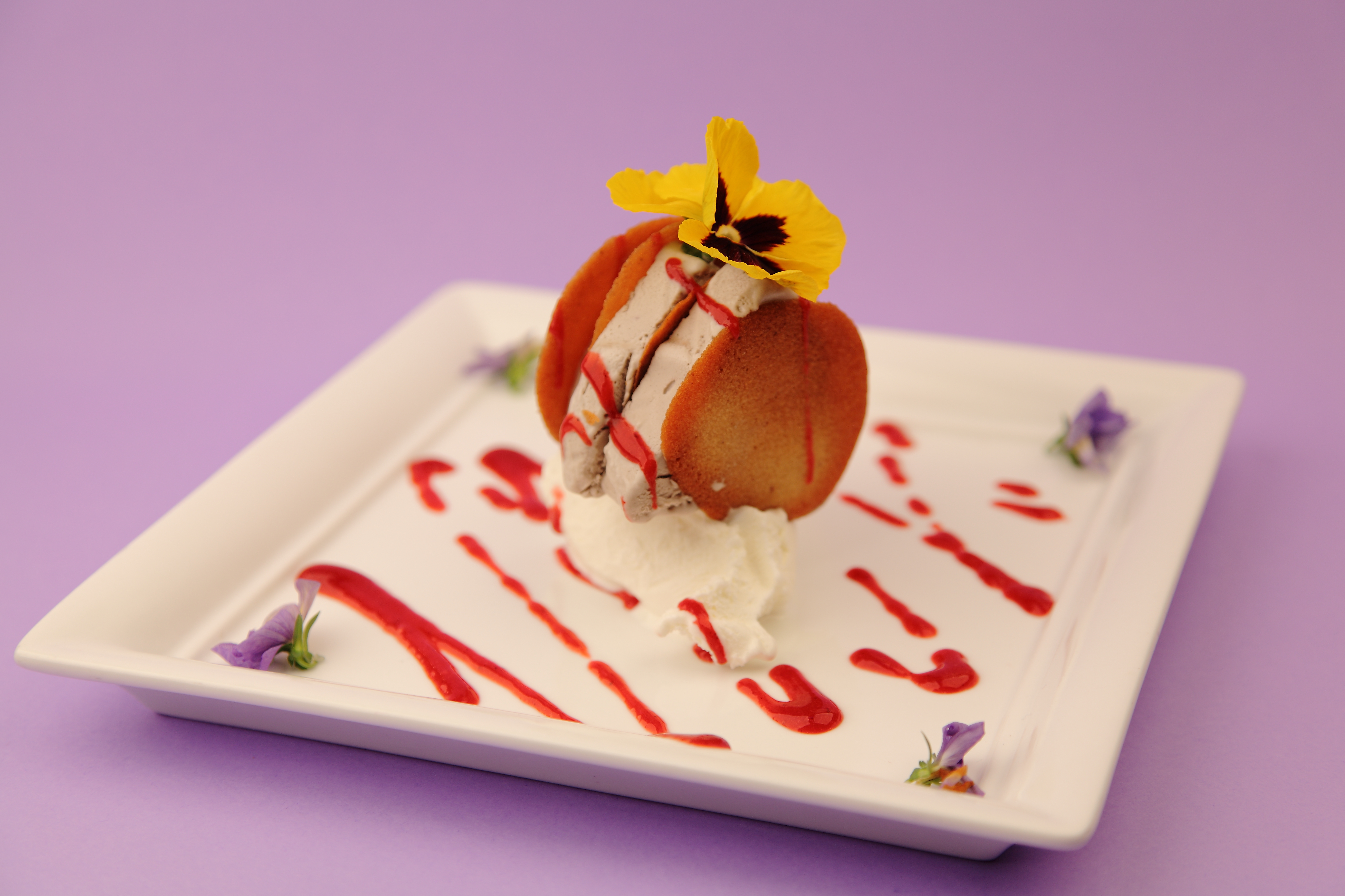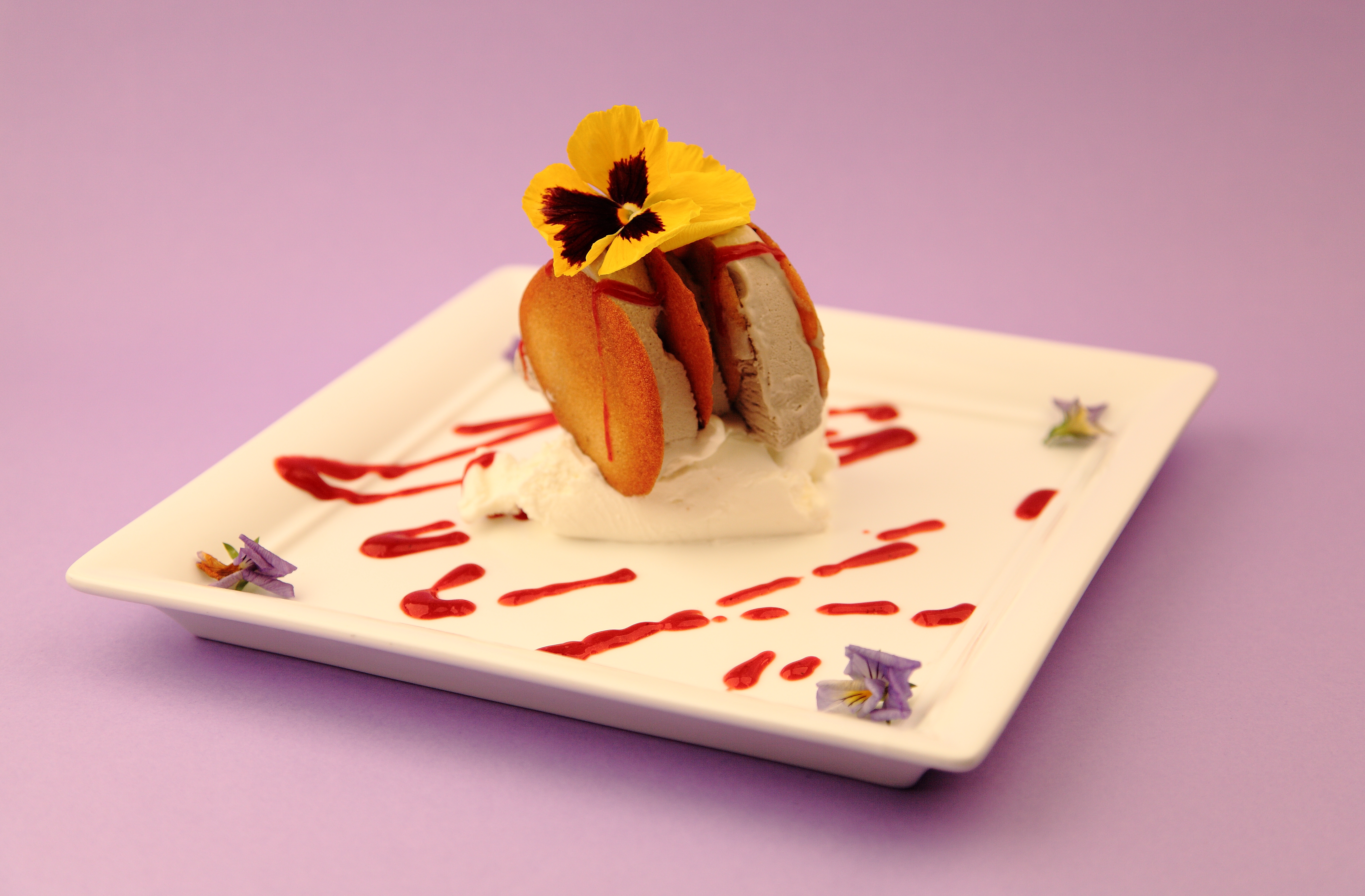 Cialde di zenzero con mousse di violetta e gelato al bergamotto