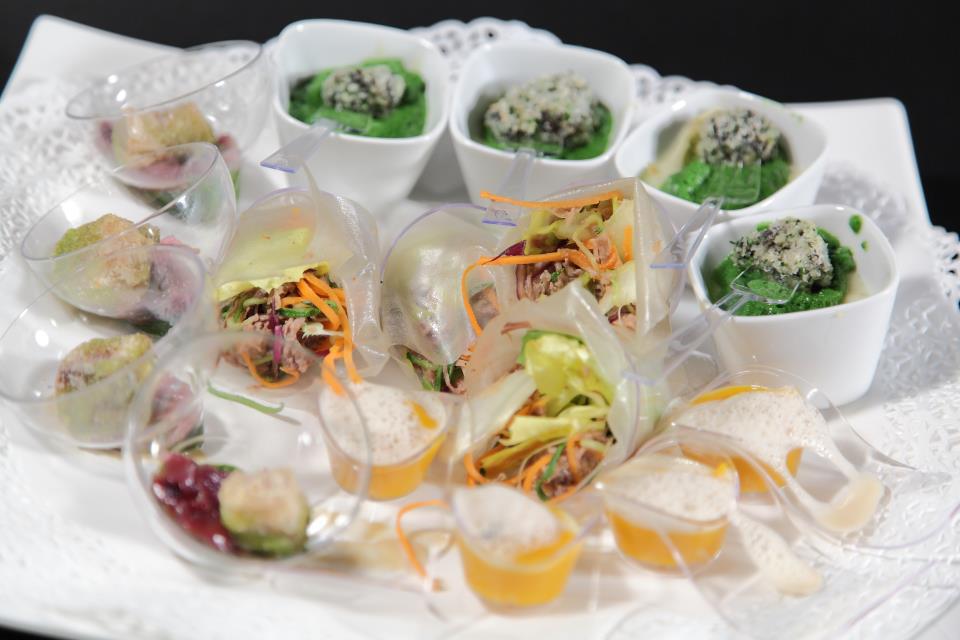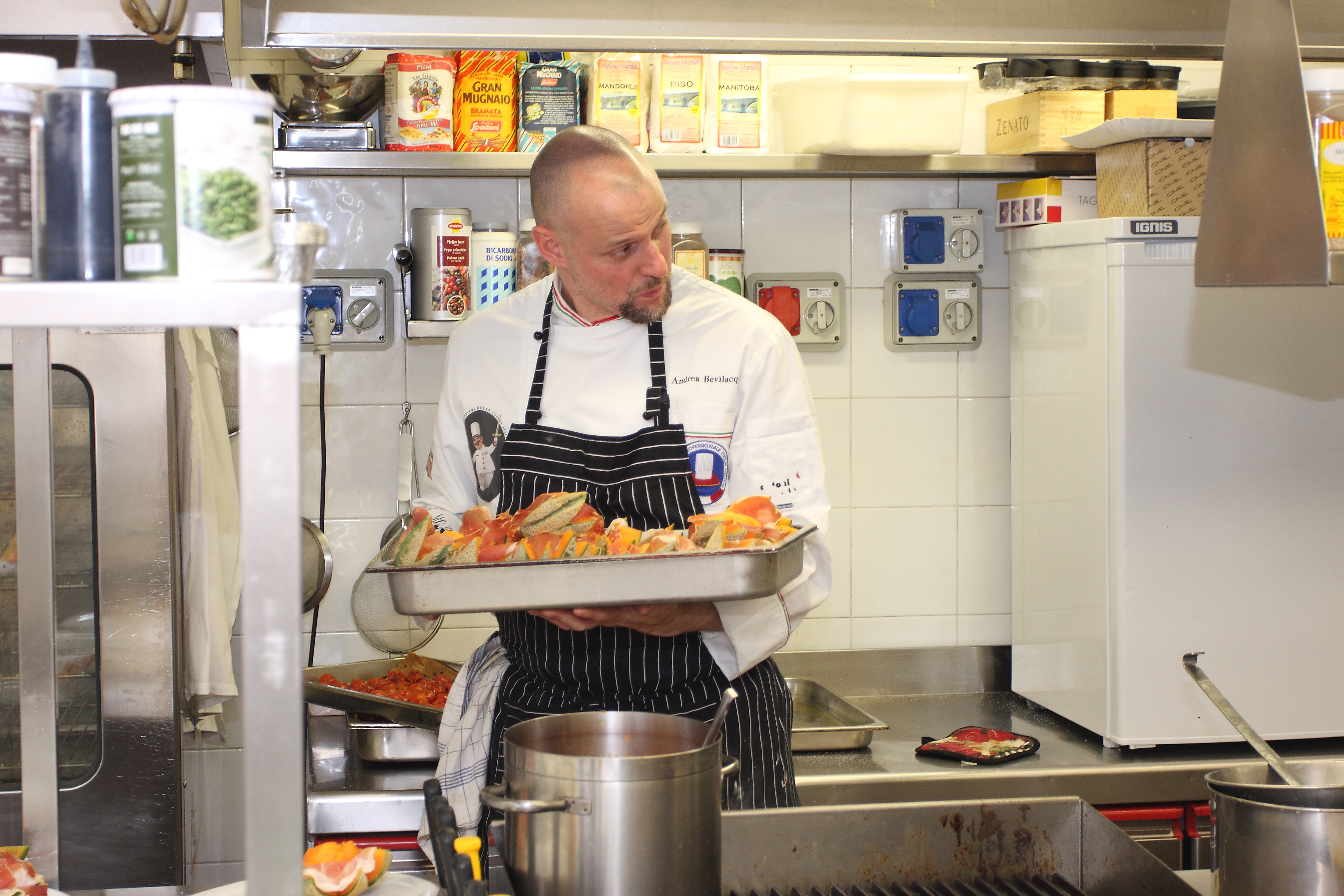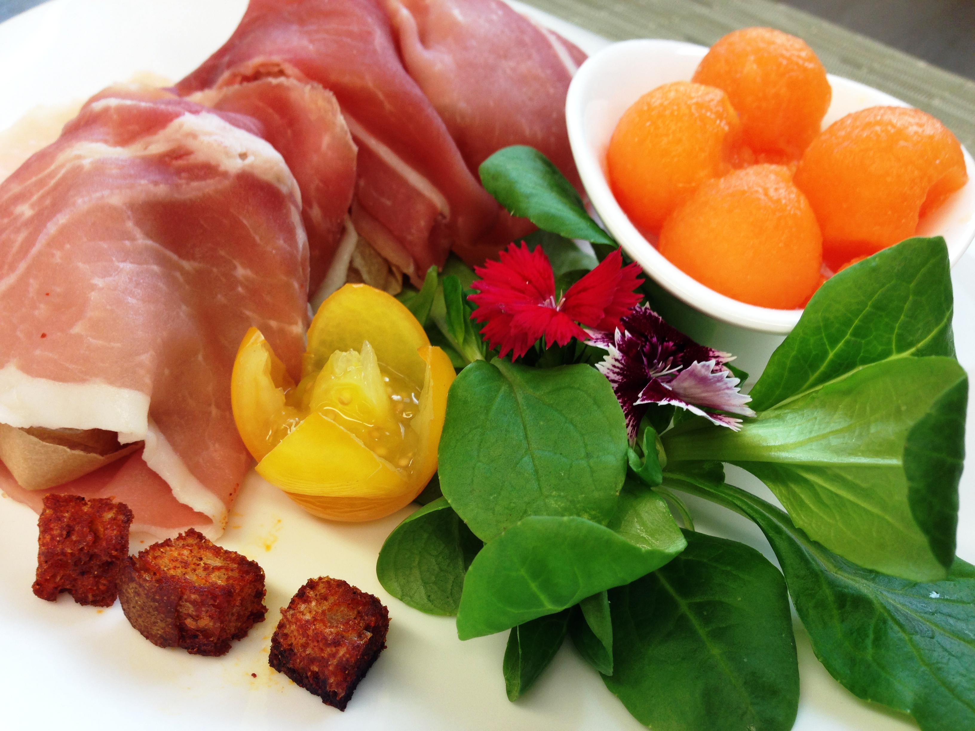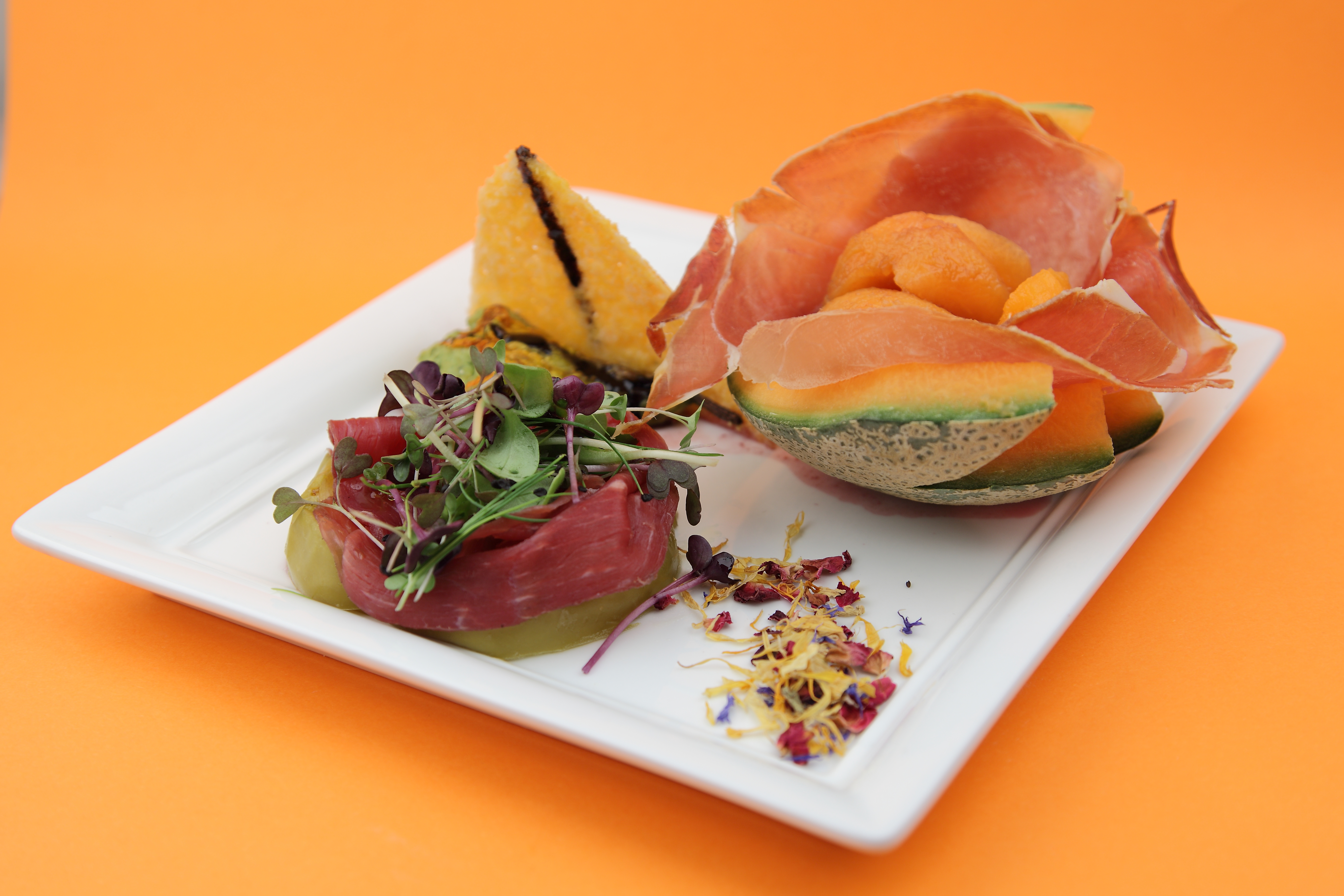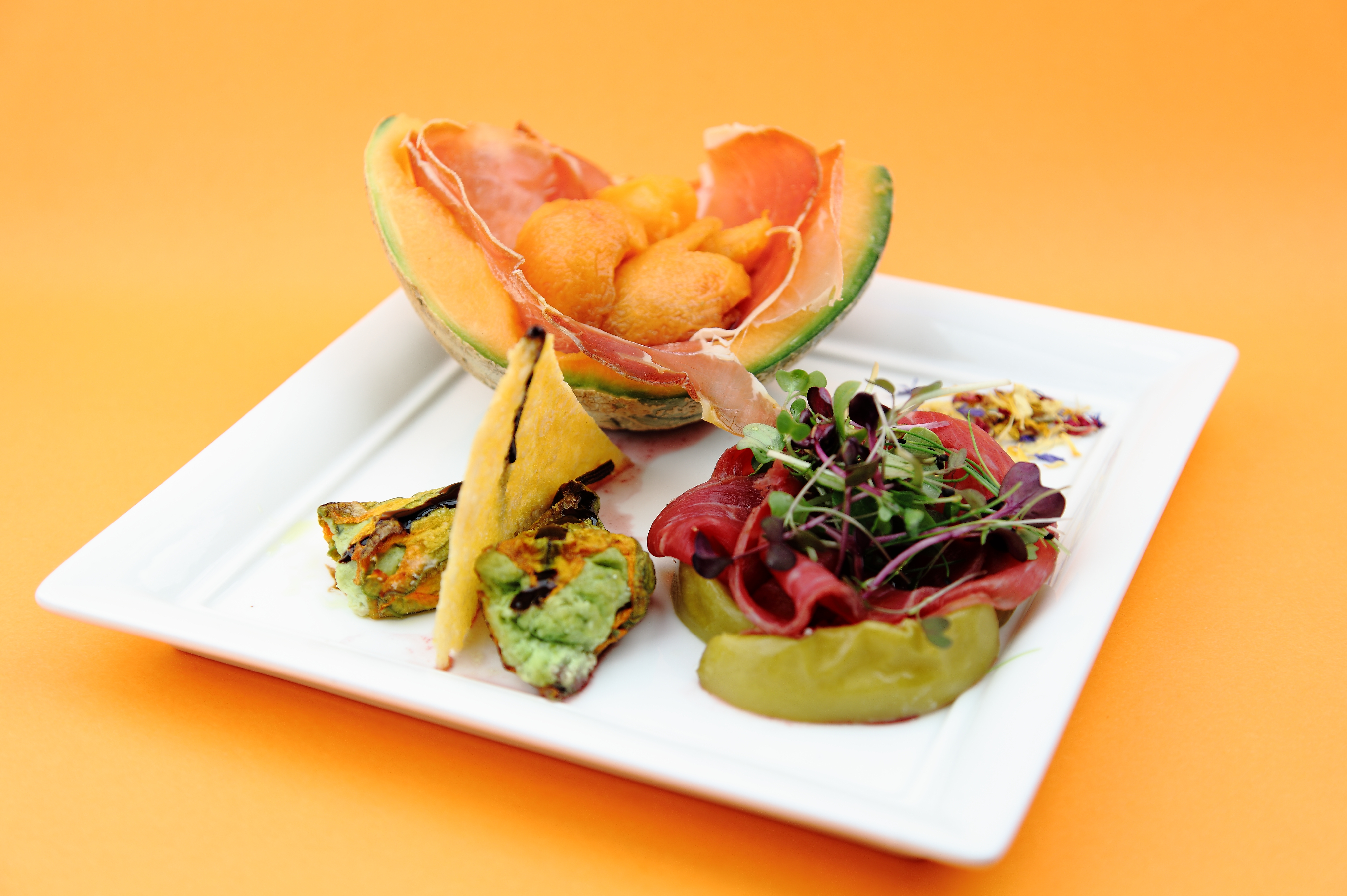 Crudo di Parma 24 mesi con melone al Porto Rosso, Carne Salada con mele Granny Smith, Fiori di zucca ripieni di ricotta e basilico, gratinati in forno con chip di parmigiano.