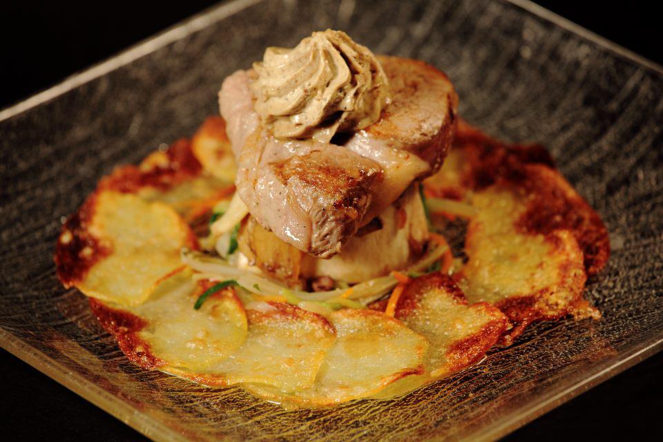 Filetto di vitello e funghi porcini con verdurine servito in osso e corona di patate gratinate.