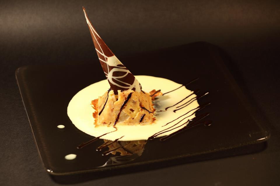 Tortino di pane e pere con gocce di cioccolato e salsa alla vaniglia.