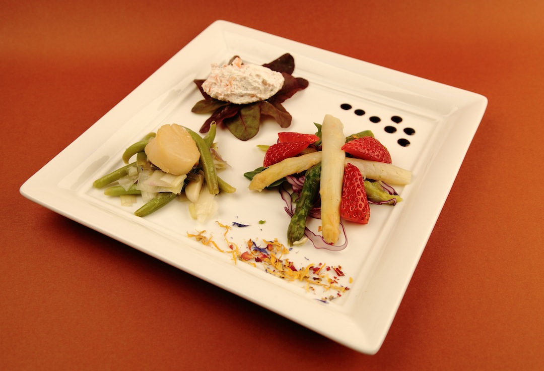 Insalata di asparagi bianchi e verdi e fragole.