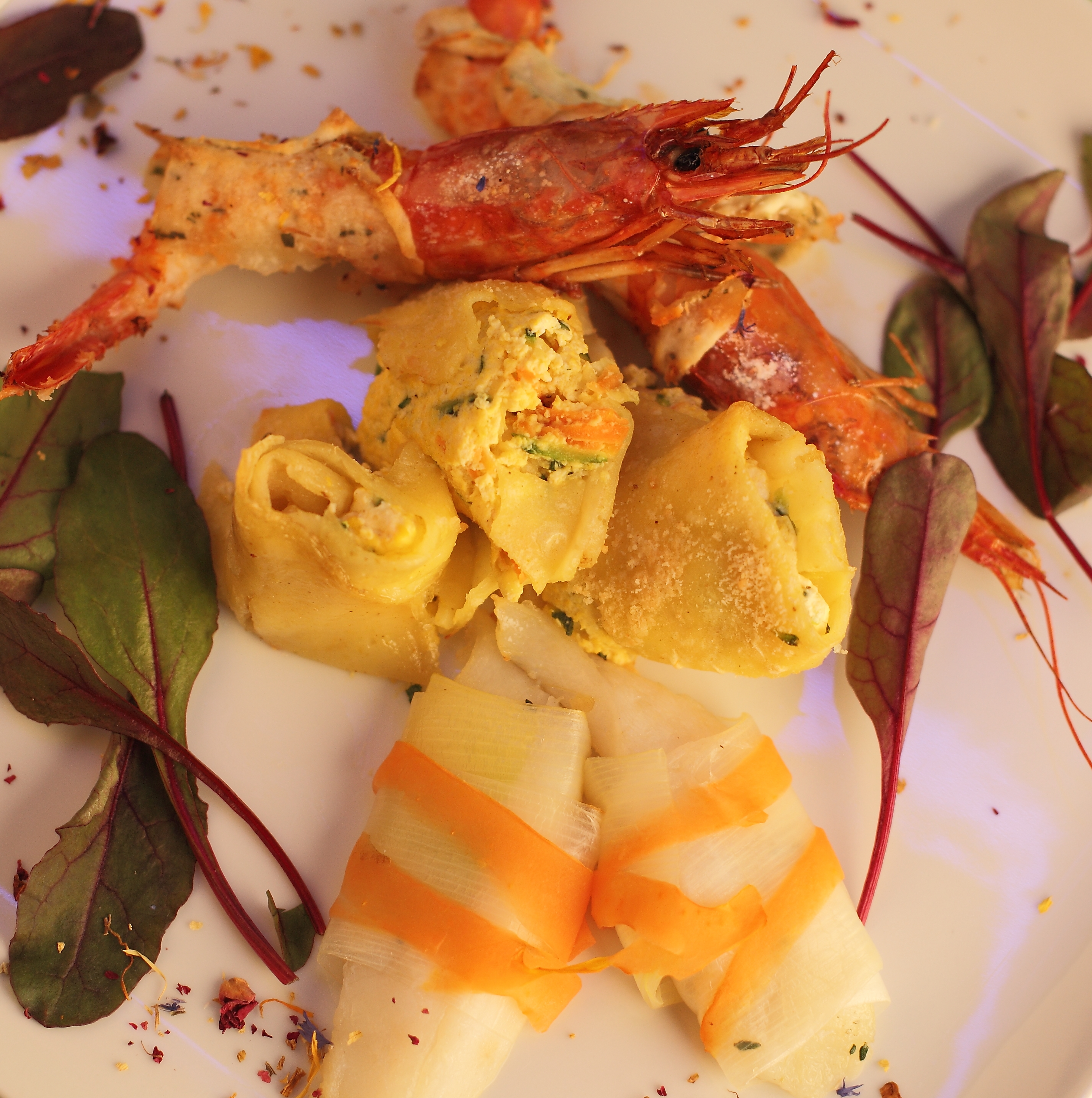 Gamberoni in crosta di lavanda e cocco.