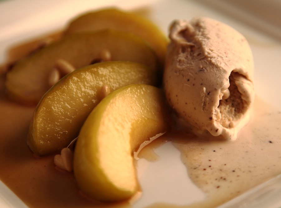 Spicchi di mela verde allo sciroppo di pinoli, uvetta di Corinto, con gelato alla cannella e cialda croccante.