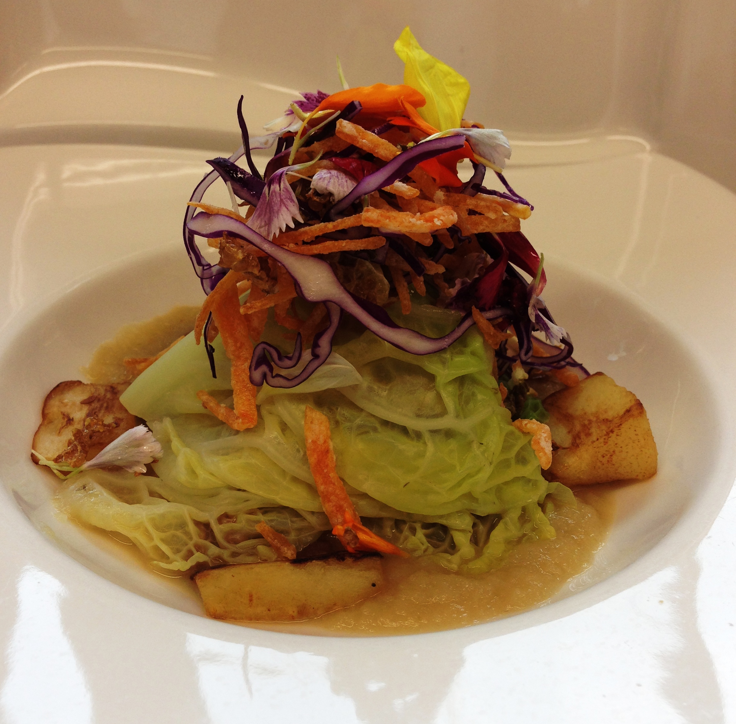 Ragout di Topinambur al sugo di agnello ,purea di cipolla al whisky con radici e fiori.