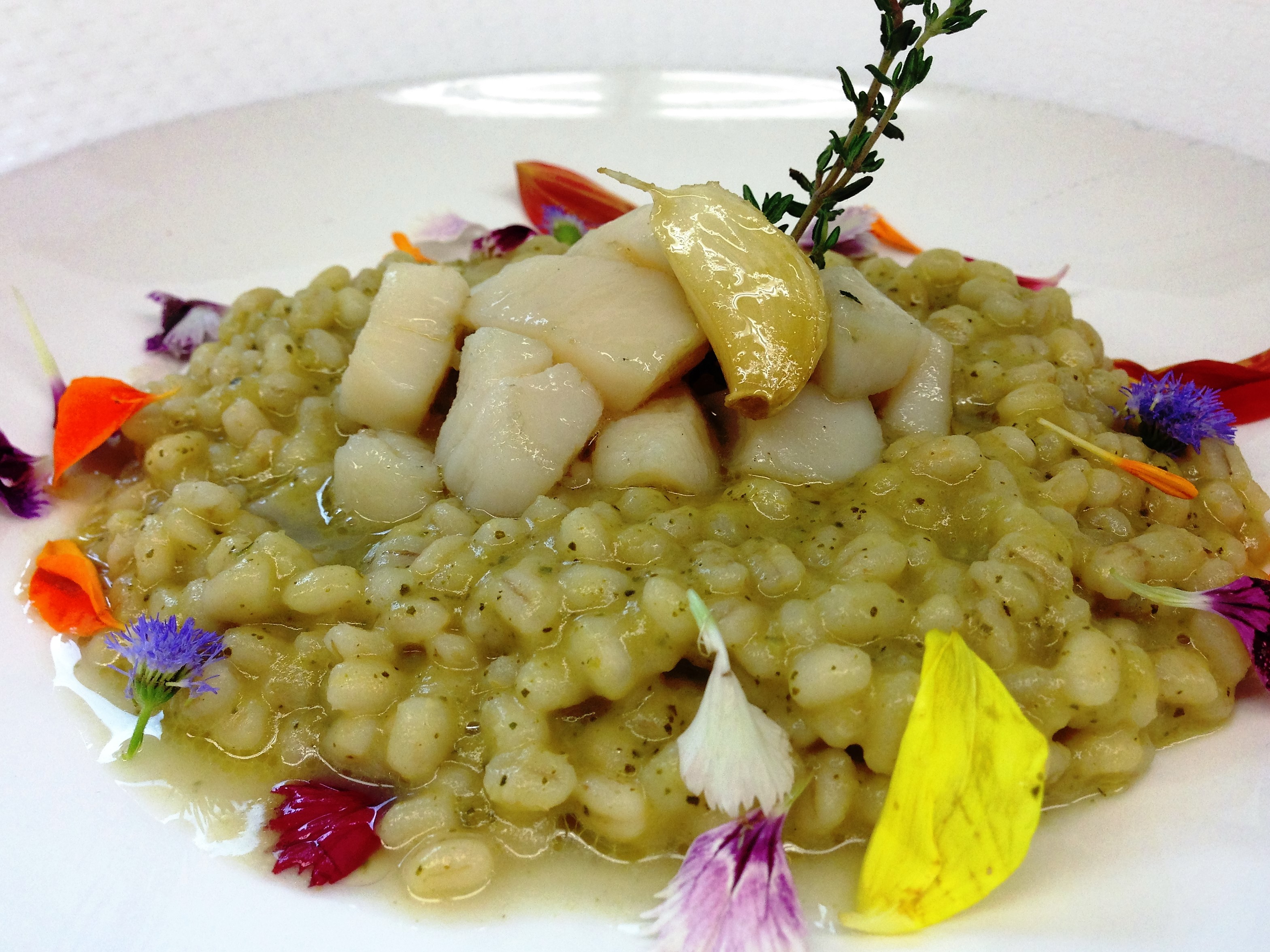 Orzotto alla crea di zucchine , Nasturzio e piccolo ragout di capesante al timo