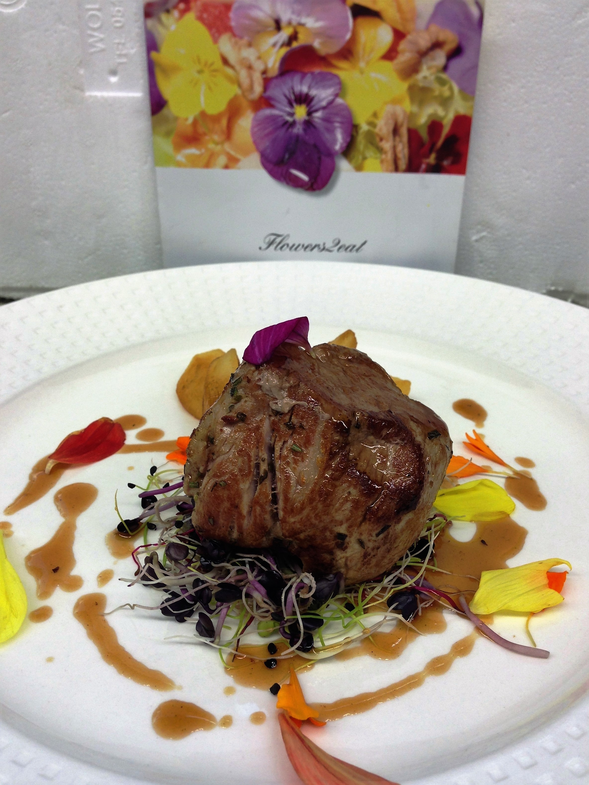 Filetto di suino in crosta di sale con riduzione al Porto bianco e mille fiori.