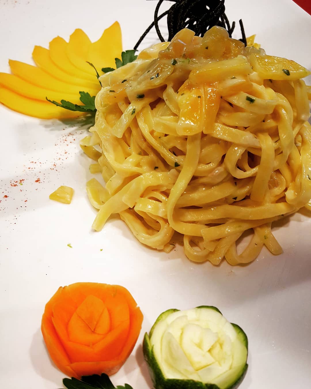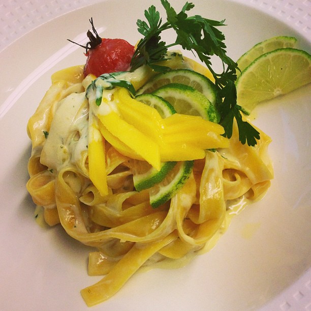 Condiamo le tagliatelle con questa salsa, e una volta nel piatto, grattugiamo sopra la buccia del Lime; decoriamo con fette sottili di mango e spicchi di Lime fresco