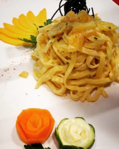 Avevo scelto come pasta le tagliatelle, perché da buon Chef emiliano, è una di quelle tipologie di pasta che mi piace portare in giro con me per il mondo. Sono tante le ricette per le tagliatelle, ognuno di noi ha la sua speciale e di certo non ho la presunzione di voler definire la mia come quella giusta. voglio però condividere le mie di ricette semplicemente per il gusto non solo di cucinare ma per esprimere e lasciare qualcosa a qualcuno.